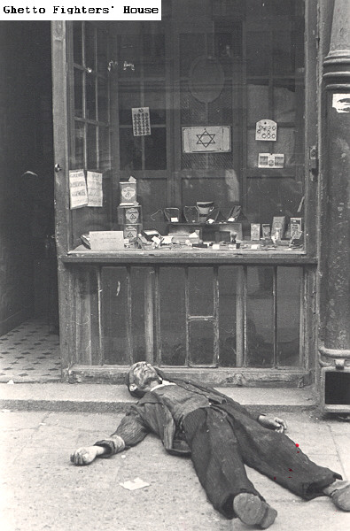 2.31 From the photographs of Willi Georg: The body of a man lying in front of a shop in the Warsaw ghetto.
