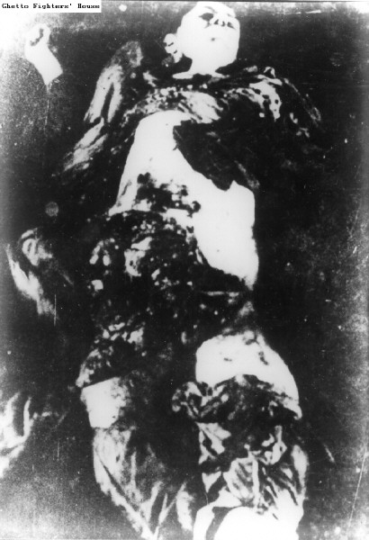 2.68 A girl walking past the bodies of two Jews hanged on a post in a street in Rzeszow.